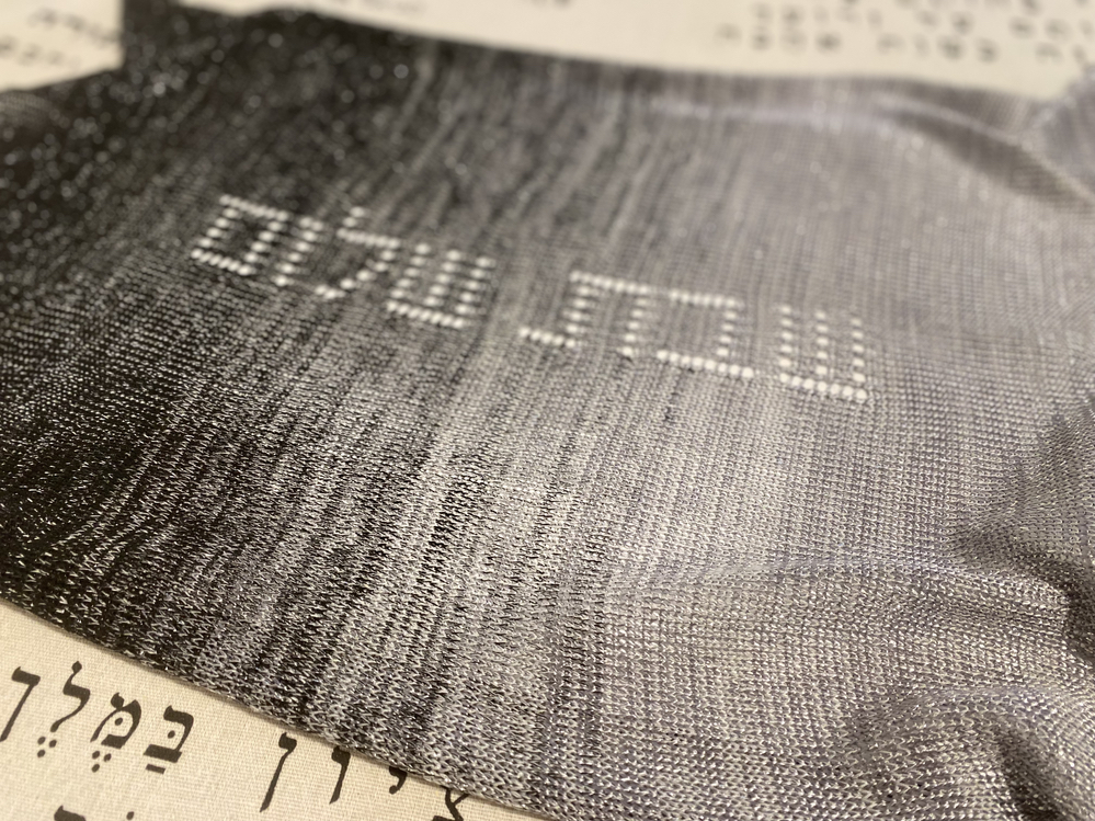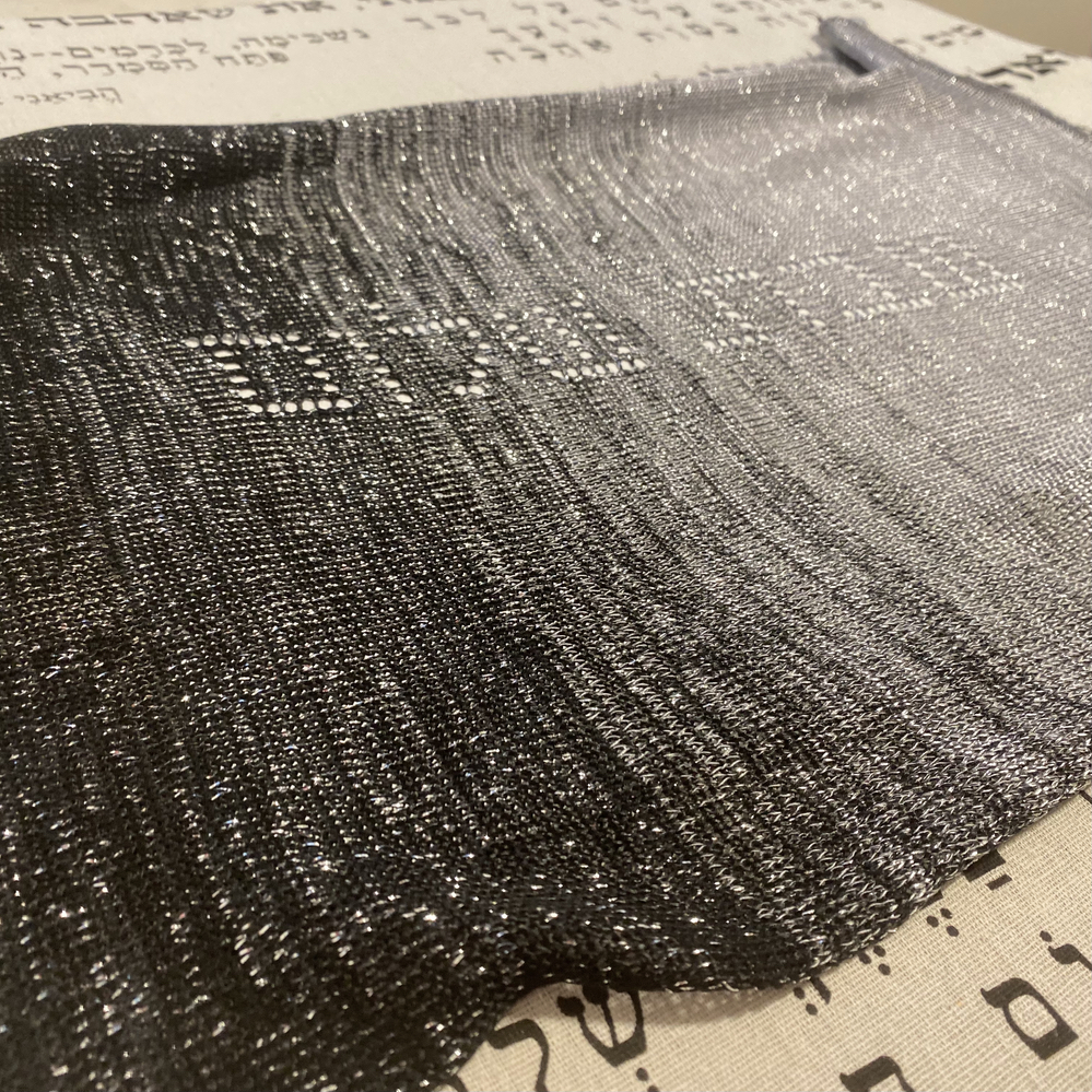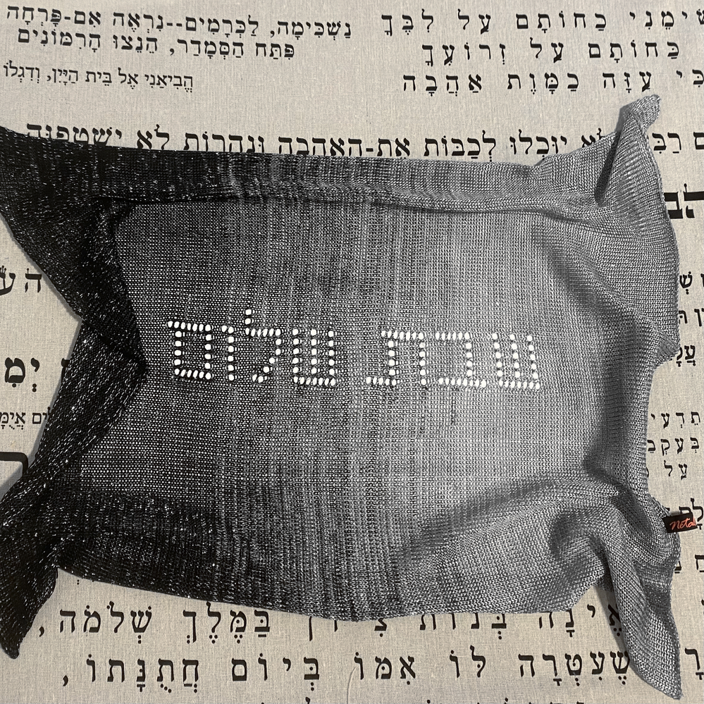 - Laced letters of “Shabbat Shalom” knitted in.
