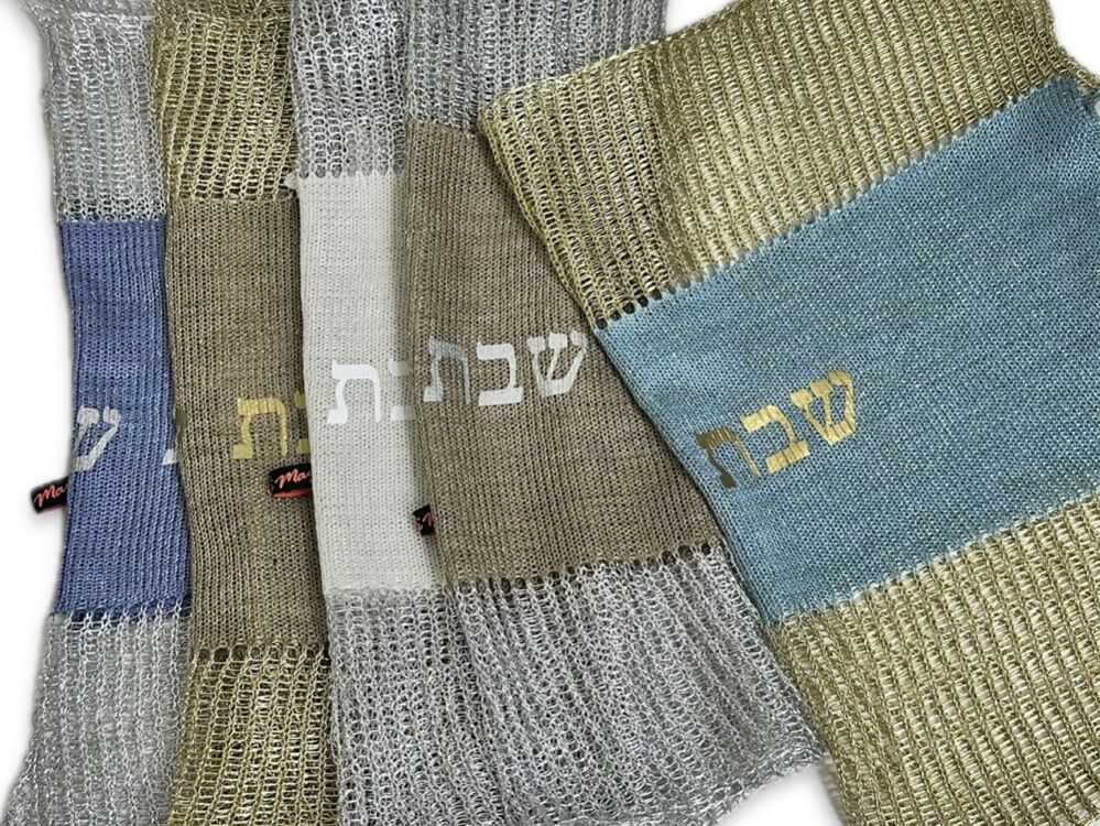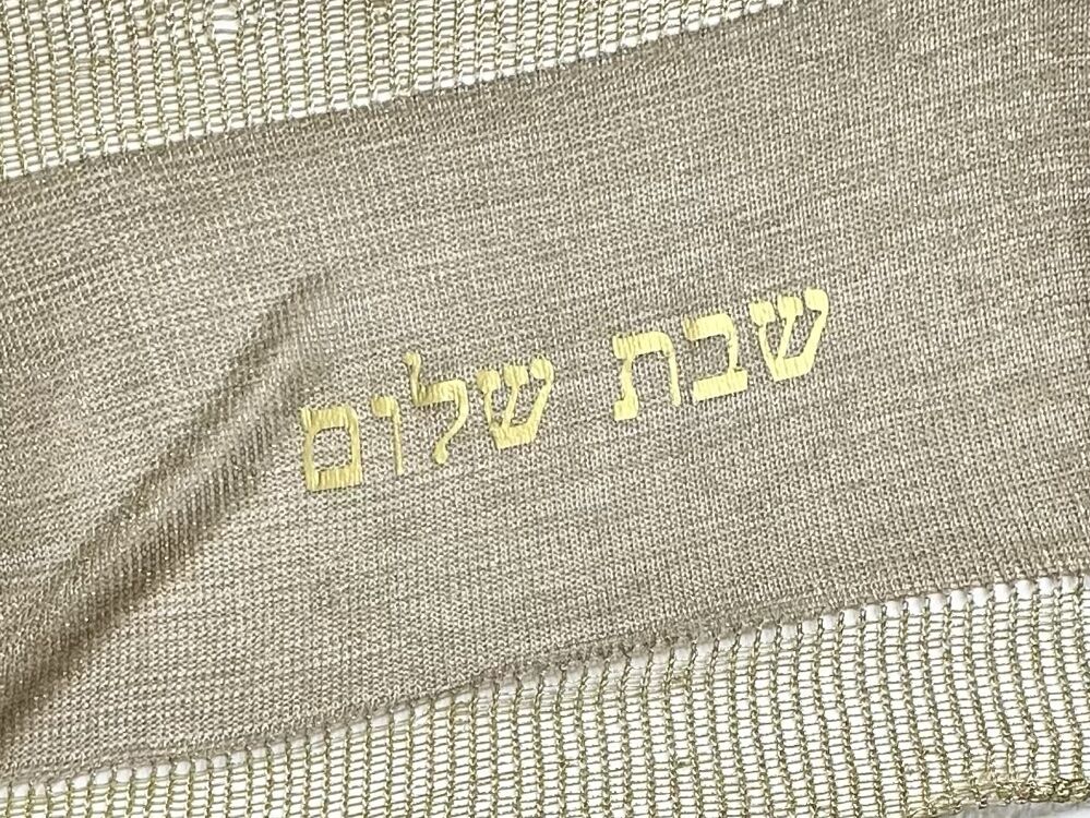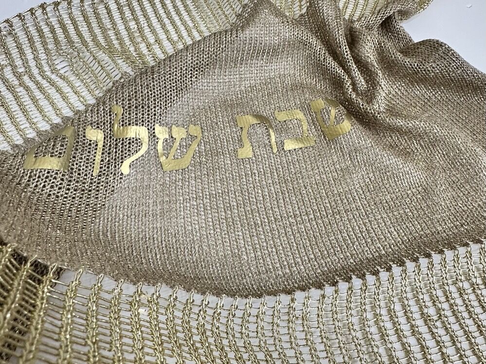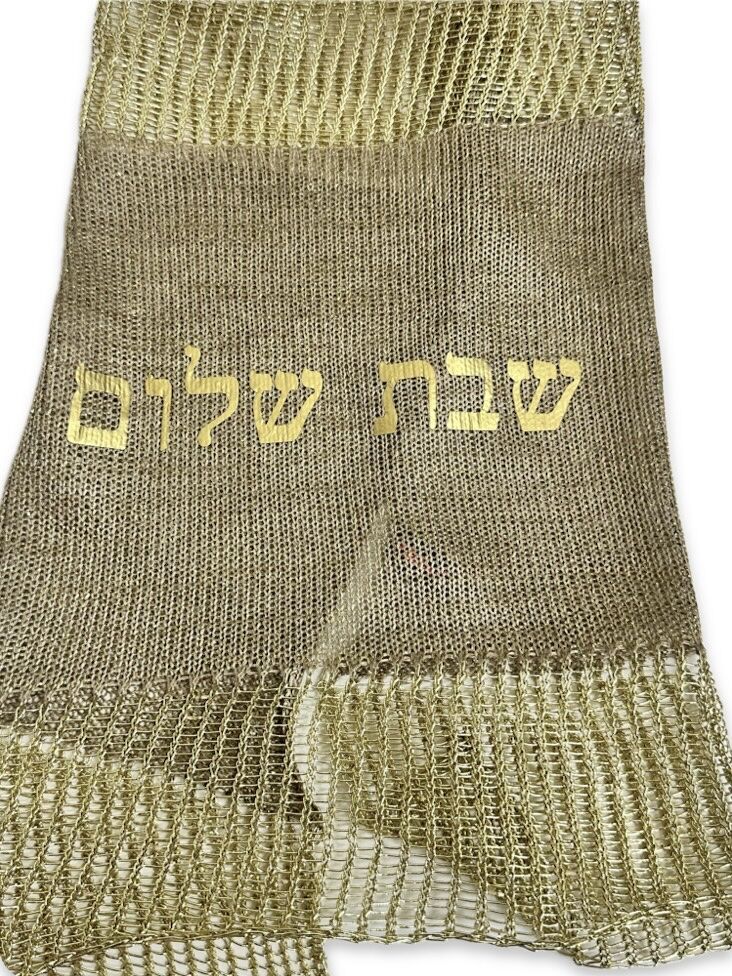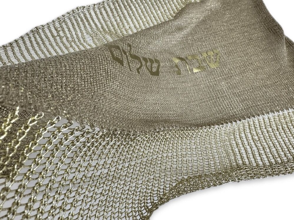 This piece combines open mesh with denser texture, creating a delicate play of transparency and depth. The Hebrew words “Shabbat Shalom” are subtly embossed at the center in a muted gold finish, appearing almost as an organic part of the piece.